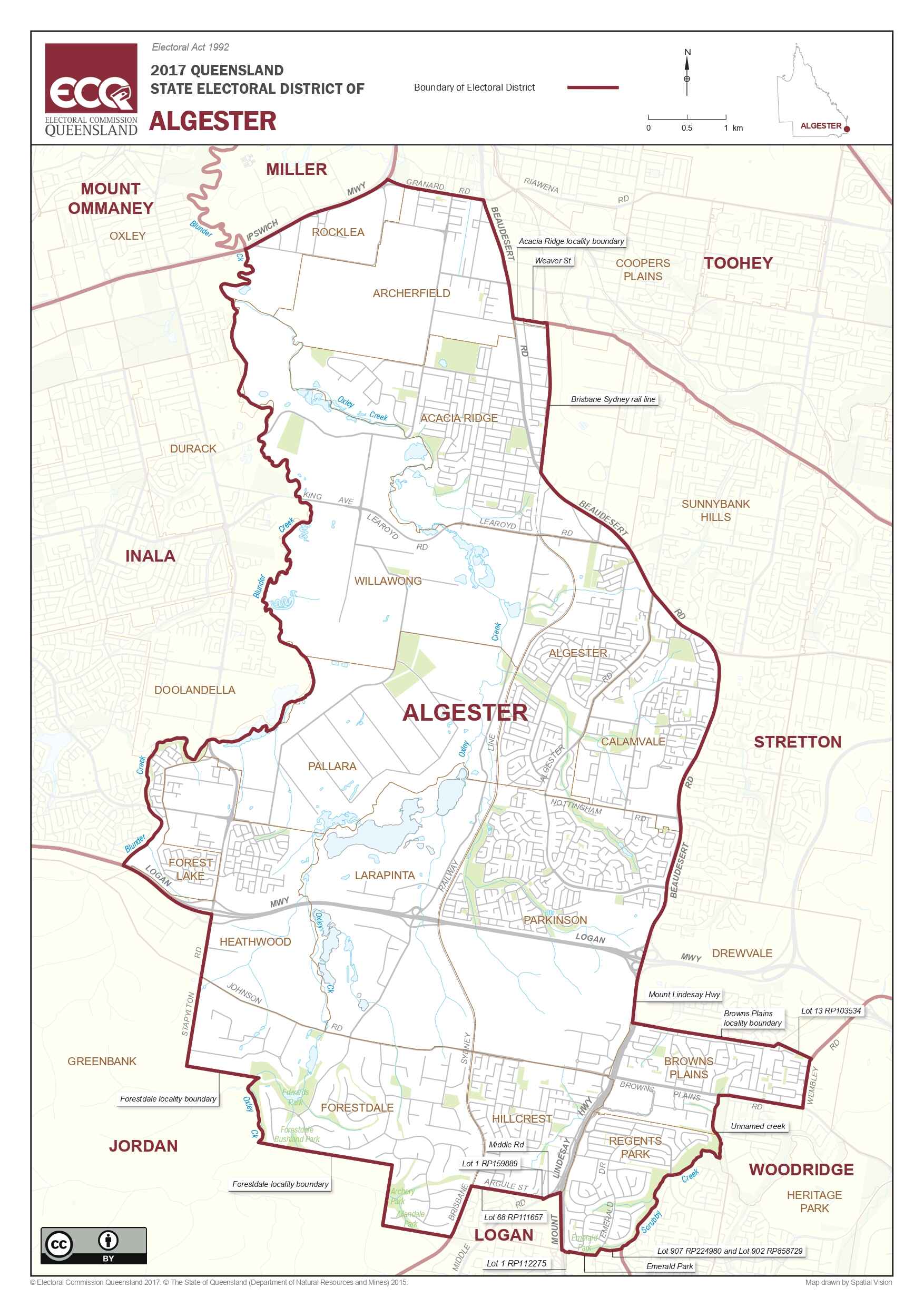 Algester Electorate takes in the suburbs of Acacia Ridge, Archerfield, Algester, Parkinson, Calamvale, Hillcrest, Forestdale, Heathwood, Larapinta, Pallara, Browns Plains and Regents Park.